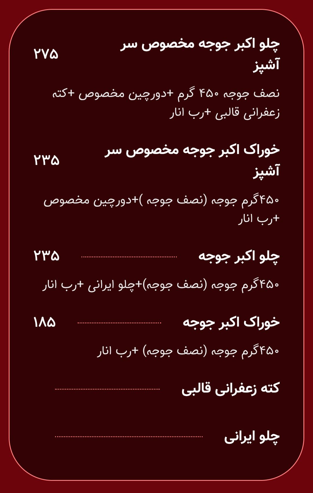 رستوران اکبر جوجه سنندج یکی از نمایندگی های رستوران های زنجیره ای اکبر جوجه برادران کلبادی می باشد که در سنندج افتتاح شده و علاوه بر اکبر جوجه غذاهای متنوع دیگر هم دارد .رستوران اکبر جوجه سنندج در تهیه غذاهای خود از بهترین وتازه ترین مواد اولیه از قبیل برنج صد رصد ایرانی هاشمی اعلا وگوشت تازه گوسفندی استفاده میکند .